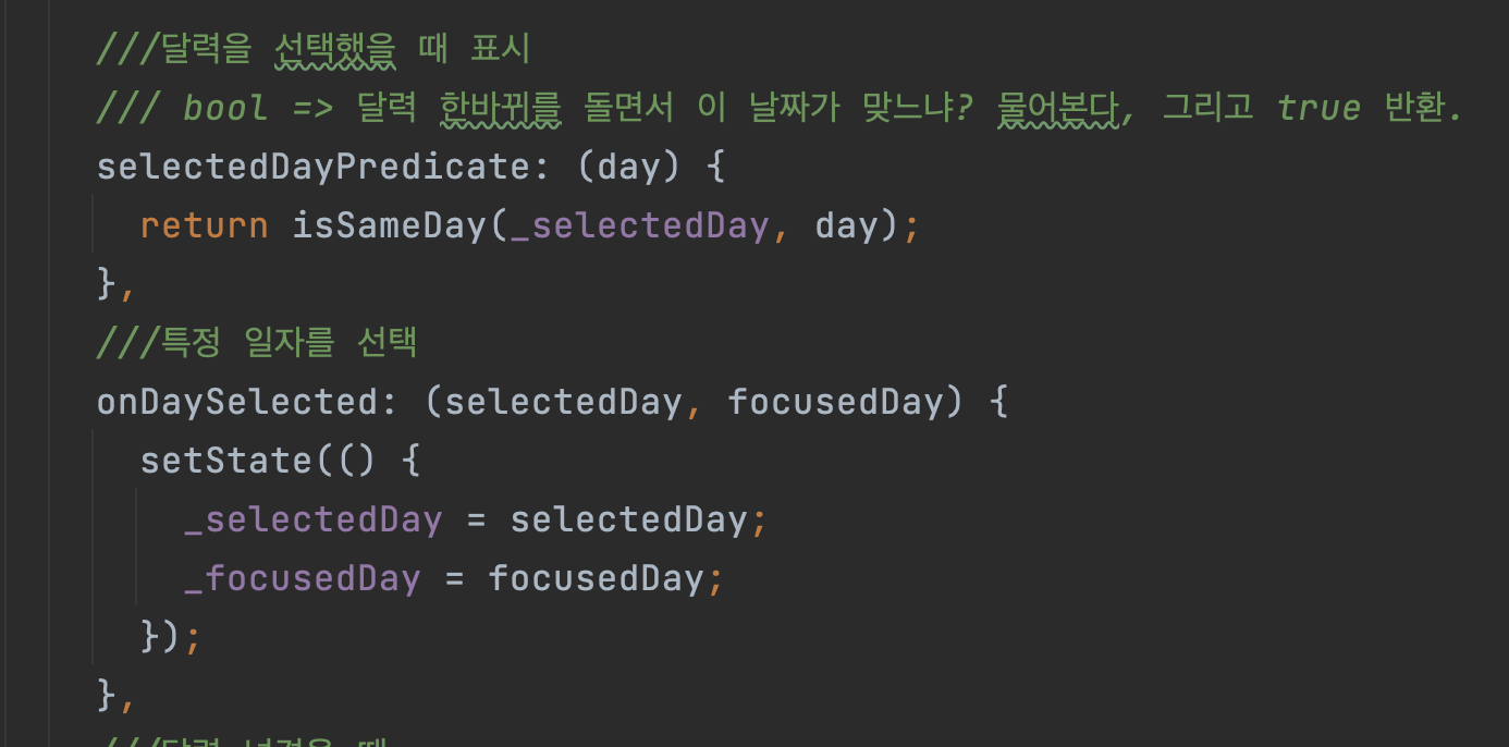 만약 선택된 날짜, selectedDay가 2월 16일이면, 저 day는 2월 1일부터 2월 28일 넘어 3월 초, 현재 달력이 보이는 모든 날짜를 한바퀴 돈다. 그러면서 마치 금도끼 은도끼처럼, "이 날짜가 맞느냐?"를 isSameDay(_selectedDay, day) 함수를 통해 물어본다. 날짜가 다르면 계속 false를 반환할 것이다. 그리고 2월 16일이 되어서야 true를 반환한다. 그리고도 종료를 안하고 3월 초까지 한바퀴 여정을 마치게 된다.